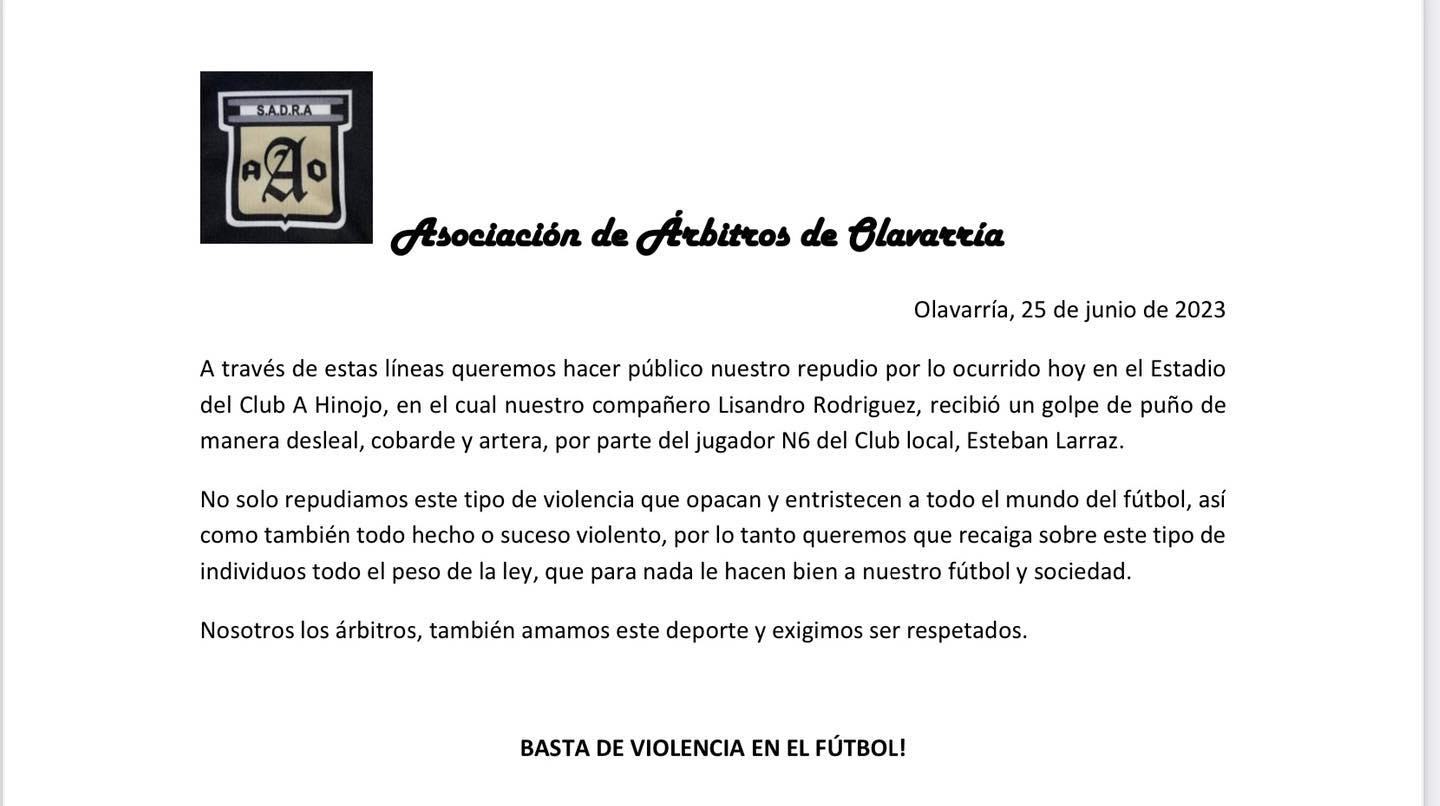 La Asociación de Árbitros de Olavarría lanzó el siguiente comunicado: