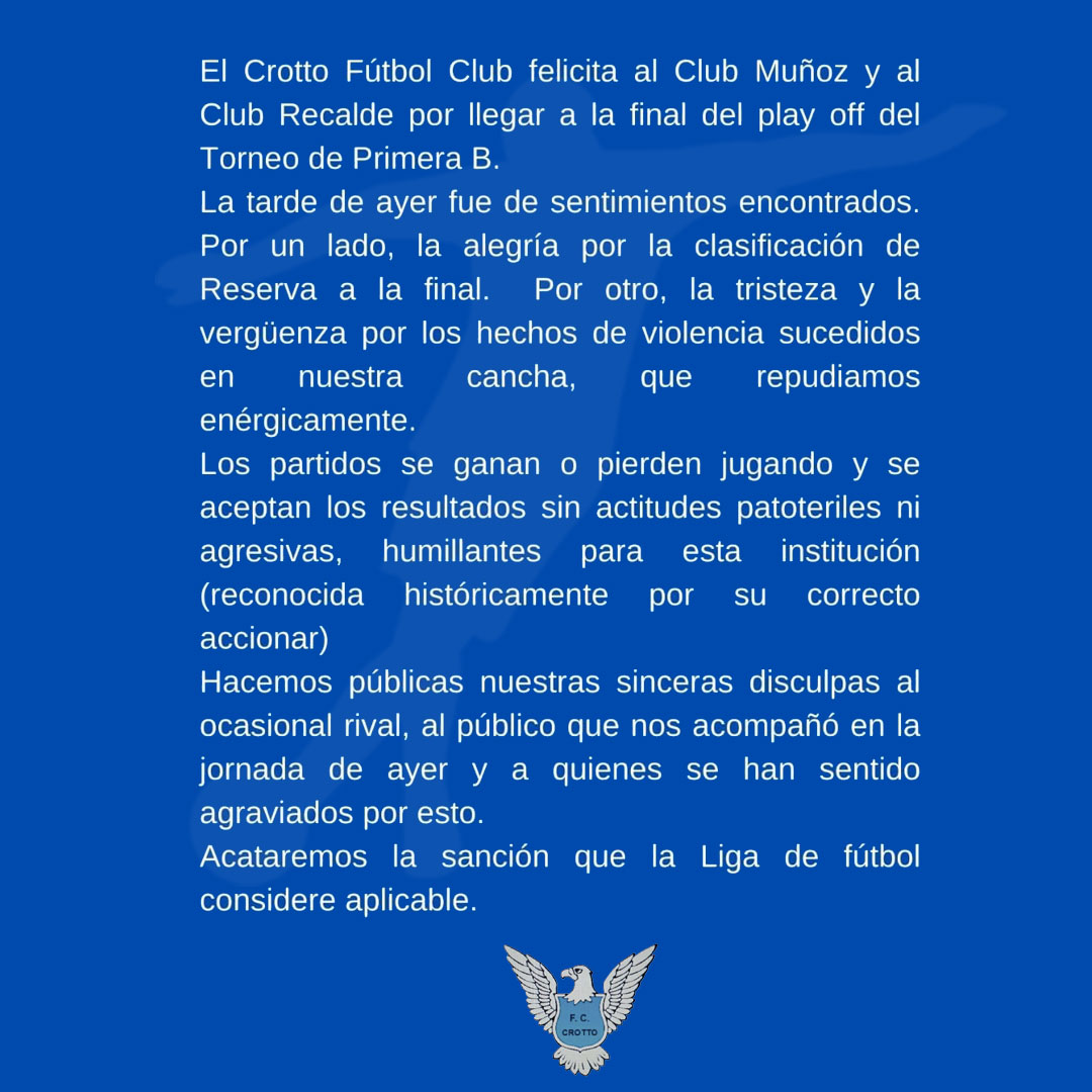 El arquero suplente de Crotto agredió a Abel Veneciano, uno de los líneas del encuentro. El comunicado del club: